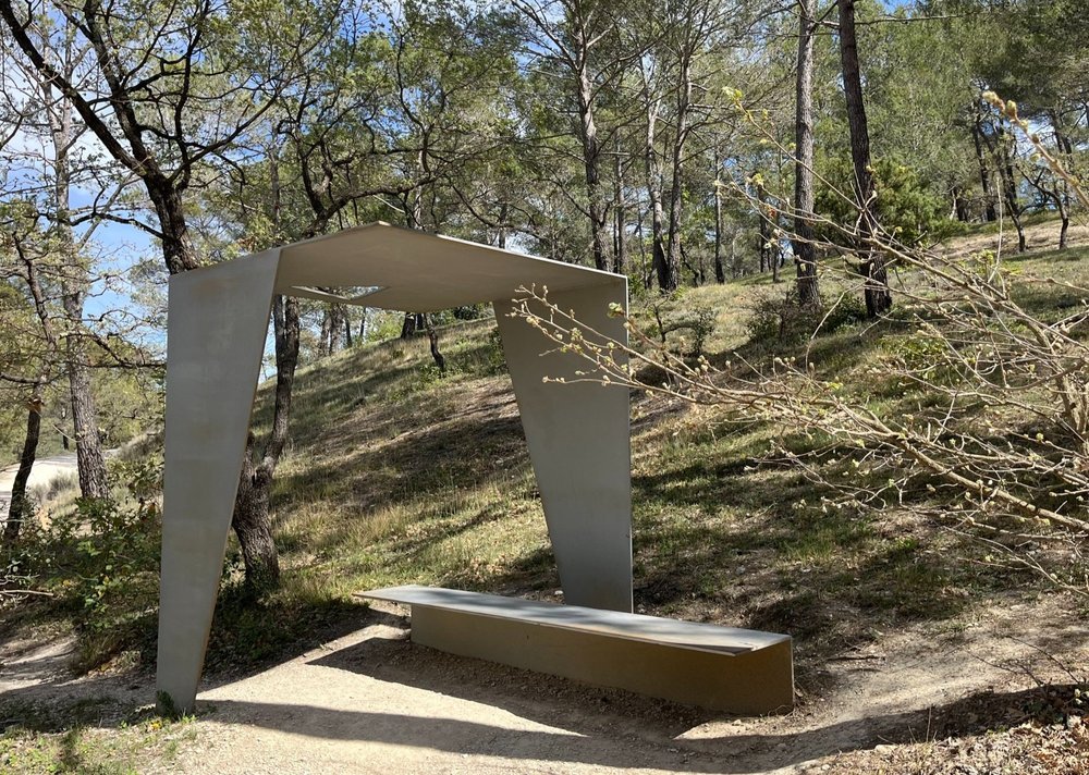 Op het uitgestrekte terrein met werk van kunstenaars en architecten onder wie Louise Bourgeois, Calder, Sean Scully, Jenny Holzer, Andy Goldsworthy, Sophie Calle, Ai Weiwei, Frank Gehry, Renzo Piano, staat ook een ‘origami bank’ van Ando, een soort bushokje, met daarboven een uit dezelfde vorm ‘geknipte’overkapping met een driehoekige uitsparing, waardoor je een driehoekig stukje stukje lucht ziet dat weer als een vage lichtvlek terugkeert op de bank. Hier blijf je graag zitten, ook al zal er nooit een bus komen.