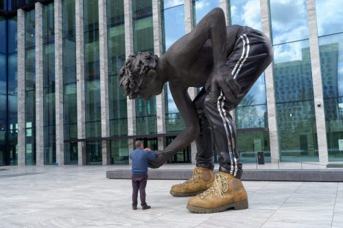 Bij het woord ‘standbeeld’ denk je toch gauw aan een groot stenen of bronzen beeld van een personage op een hoge sokkel in een park of op een plein. Om te zien wie het voorstelt moet je omhoog kijken en meestal is het een persoon naar wie de mensen ook geacht werden op te kijken. Eeuwenlang werden beelden van belangrijke personages op die manier neergezet in de openbare ruimte, hoog op hun sokkels, uittorenend boven het gewone volk.
