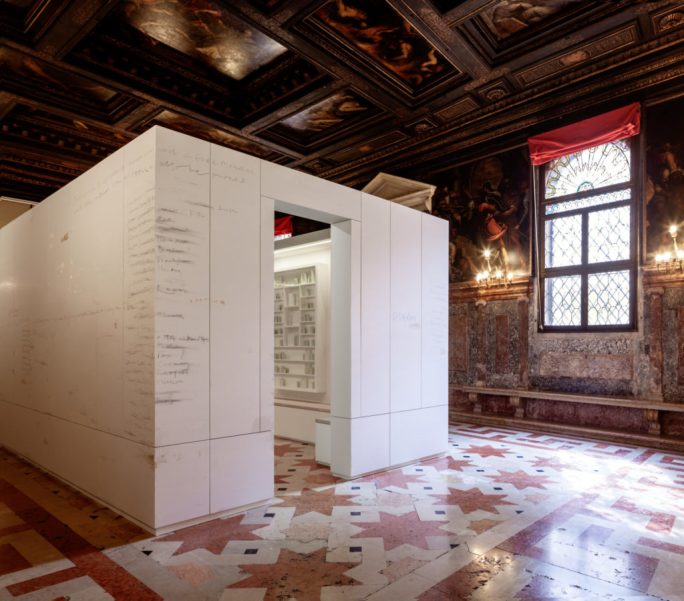 Vlakbij de Fenice Opera bevindt zich het Ateneo Veneto uit de zestiende eeuw, waar geleerden bijeen kwamen om te discussiëren over boeken en geschriften in de vele talen die toentertijd in Venetië werden gesproken en geschreven. In de grote zaal van het Ateneo bouwde Edmund de Waal een bibliotheekruimte voor tweeduizend boeken van schrijvers die hun land moesten verlaten, of in hun eigen land niet vrijuit konden schrijven. In die boeken kan je je naam schrijven, als teken dat een boek gezien is, dat het bestaat. Aan de wand vier witte vitrines met kokers van dun porselein in verschillende maten en vormen. Je kan bedenken dat ze de herinnering bevatten aan vervluchtigde woorden en gedachten. Onder de fijne laag porselein waarmee de buitenkant van de bibliotheek is bestreken, schijnen op dunne gouden vellen geschreven namen door van verdwenen en verwoeste bibliotheken, van lang geleden, zoals die van Niniveh en Alexandrië, en van recent vernietigde bibliotheken, waaronder die van Timbuktu, Aleppo en Mosul.